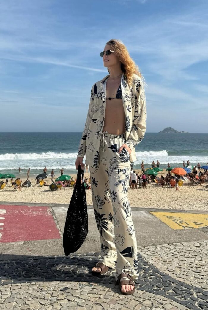 Falando em maiô, ele é o verdadeiro curinga do verão. Para essa temporada, aplicações como babado e acrílico aparecem como destaque nessas peças. O maiô pode sair da praia direto para a cidade com uma calça em linho leve, uma saia fluida ou até um jeans mais solto. Funciona como body e carrega esse charme contemporâneo que mistura funcionalidade e estilo.